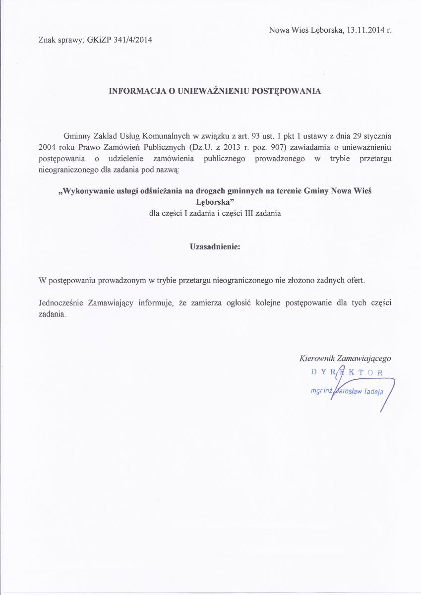 Edycja dokumentu Informacja o unieważnieniu postępowania dla części I i III zadania ( Rejon I i Rejon III)